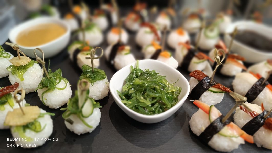 Unsere hauseigene Sushi Reis Rezeptur. / Auf einer Platte richten wir an: + klassische Sushi Röllchen in Nori Blatt, mit verschiedenen Füllungen+ (wir verwenden NIE ROH FISCH)+ Gern Surimi, Sherry Hering oder gebeizten Lachs.+ sehr lecker ist auch gebratenes Geflügel - lassen sie sich überraschen+ Nigeri Sushi Bällchen mit Nori Bauchbinde)+ California Rolls oder auch Inside - Outside genannt - mit Sesam+ Uramaki (Outside Rolls ohne Sesam)+ Temaki Sushi (gefüllte Mini Nigeri Tütchen)+ alles Mundgerecht angerichtet und Zubereitet.+ Dazu unser hauseigene Ingwer Mayo, + Wakame Salat, marinierter Ingwer, Wasabi Paste oder Wasabi Mayonnaise+ Unsere Art des Sushis - eigener Geschmack durch eigene RezepturStand: 01/2026