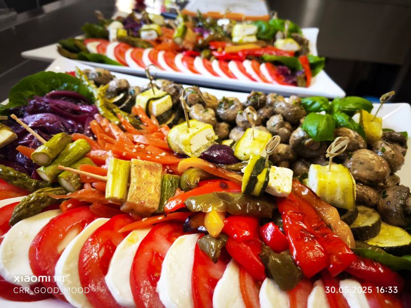 Frischer Rotkohl vom Kopf geschnitten, + nach türkischer Art mariniert mit Lorbeer, + Knoblauch, Zucker, Salz, Essig, Chilli, etc...+ das ganze mehrere Tage im eigenen Sud gekühlt mariniert, + eine würzig leckere und knackige Salatvariante.+ Angeboten und angerichtet mit einem kleinen "EisBerg" + von gebröseltem Weißkäse & garniert mit Basilikum.+ dieser Salat ist mindestens 5 Tage vorab produziert+ in der Kühlung "gereift" damit er auf dem Buffett zu Highlight wird.Stand: 01/2026