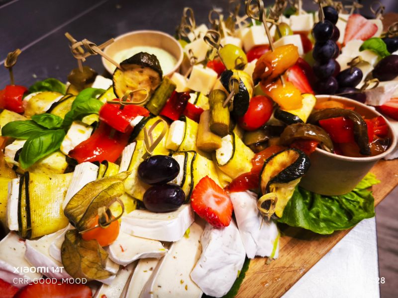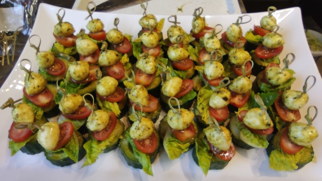Gurken Mozzarella Tomaten Canapes+ kräftige Gurken Scheiben+ mit Mini Salat Garnitur, + darauf ein Spießchen mit Mini Tomate + und marinierter Mini Mozzarella Kugel+ eine vegetarische Fingerfood Kleinigkeit + einfach anders als das klassische Tomate Mozze Spieß+ ein kleines Kunstwerk für Ihr Buffett+ Stand: 01/2027